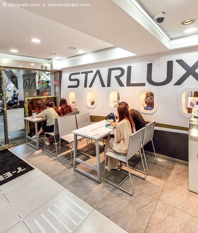 In the special Starlux themed 7-Eleven in Taipei, the store is designed to resemble the interior of a plane plus there is even a landing strip / runway directing you to the cashier – you can enjoy Starlux coffee which is usually only served aboard the planes.
